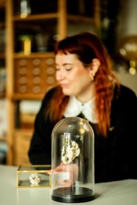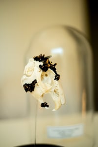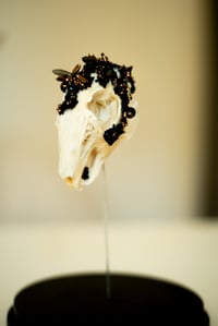 Ce crâne de lapin domestique, dont l'ennoblissement par les perles, les cristaux et les pierres Swarovski aura nécessité 7 heures de broderie, est présenté sous une cloche de verre au socle de bois.