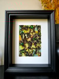 Ce tableau brodé et mis sous verre est inspiré des photos macro d'insectes, en particulier des coléoptères dont les formes et les coloris sont une source inépuisable d'inspiration pour mon travail.
