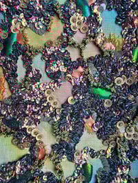 Sur un fond réalisé à l'aquarelle, les élytres de scarabée se mêlent aux paillettes changeantes au gré de la lumière de tons verts et cuivrés et de laiton doré, aux tubes de verre posés debout, à des pièces de latex irisé et aux fils de broderie pour composer un ensemble aux couleurs chatoyantes dont l’œil ressent toutes les textures.